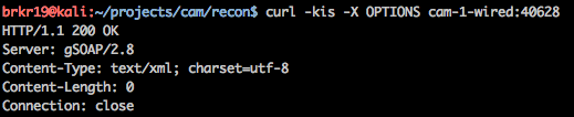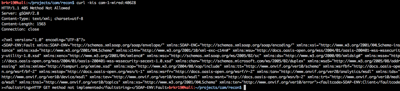 The results for port 40628 show another web server is running, this time with a server header of ‘gSOAP/2.8’. Running curl against it shows us that the service is not expecting a GET command, but since it appears to be a SOAP web service, it might be expecting a POST.