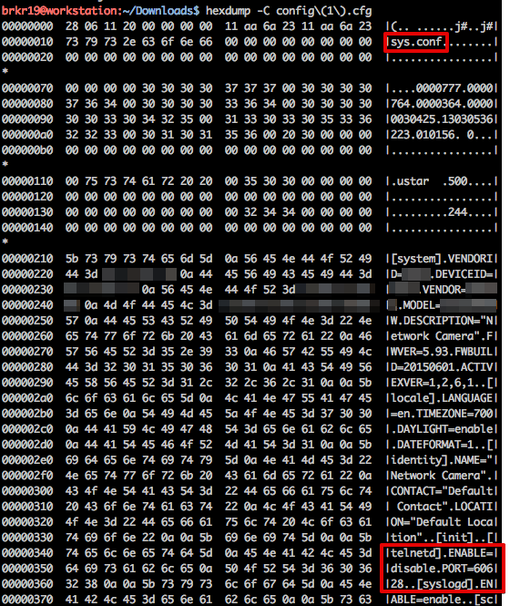 Analyzing the backup file using hexdump, shows the file may be a direct copy of a sys.conf file from the filesystem. It also looks like there are additional settings that were not made available to us from the UI, including one to enable telnet!