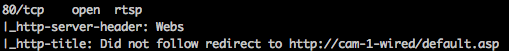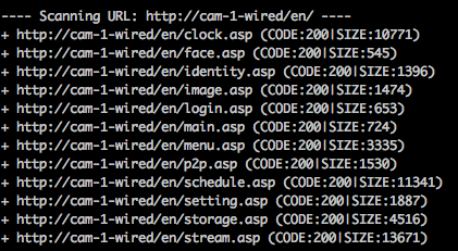 The results are interesting. It shows the web server on port 80 is something called ‘Webs’ and the server is displaying ASP pages even though I suspect the camera is running some variant of Linux. This seems like the kind of thing that could be promising, since it is deviating from a standard web stack.