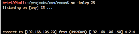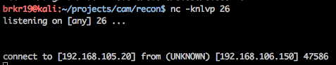 A few seconds later, I get a hit on a netcat listener I set up on my Kali box: